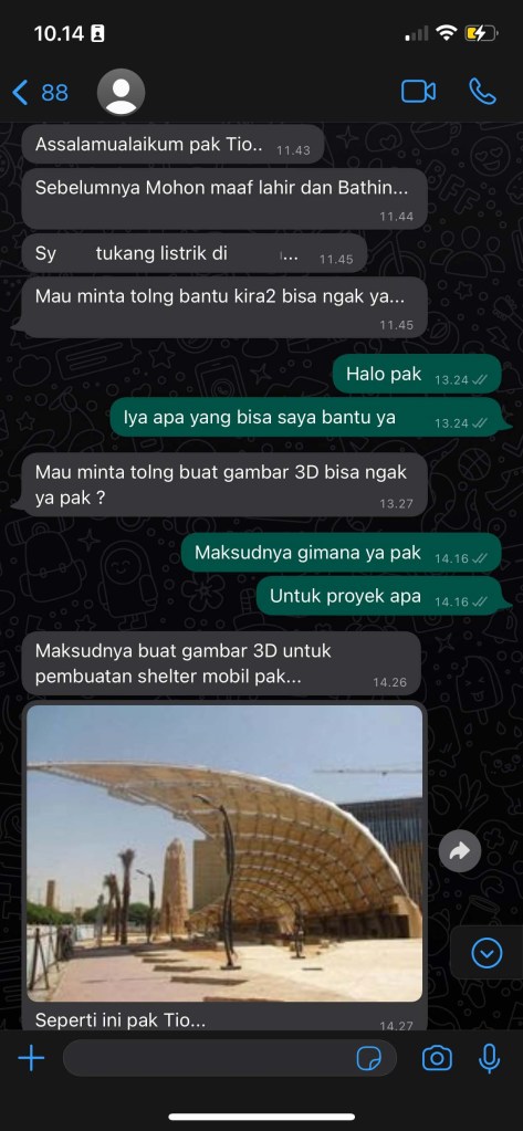 Setelah percakapan via whatsapp dan telepon, proyek tersebut berubah menjadi sebuah proyek desain kanopi untuk parkiran mobil, referensi desain pun mulai dikumpulkan untuk sebuah desain kanopi mobil di tepi pantai, tapi pertemuan tatap muka langsung dengan klienlah, yang menunjukkan bahwa yang dibutuhkan adalah sebuah benda yang lain lagi, sebuah proyek area tunggu penumpang kapal laut ke kepulauan seribu.