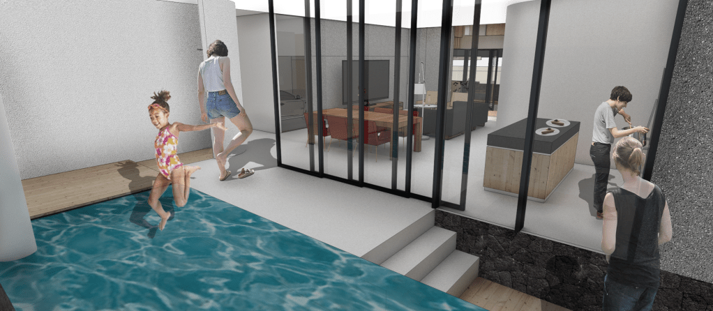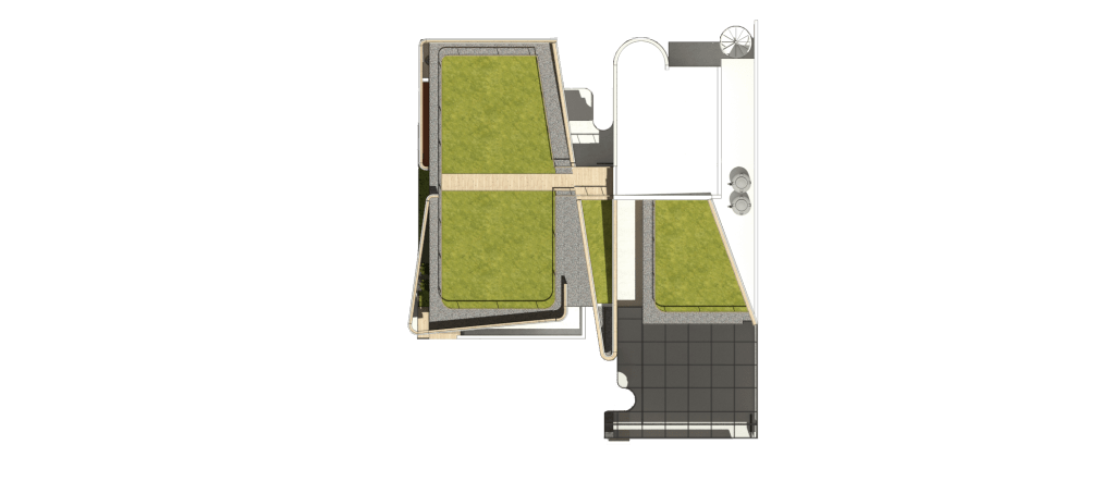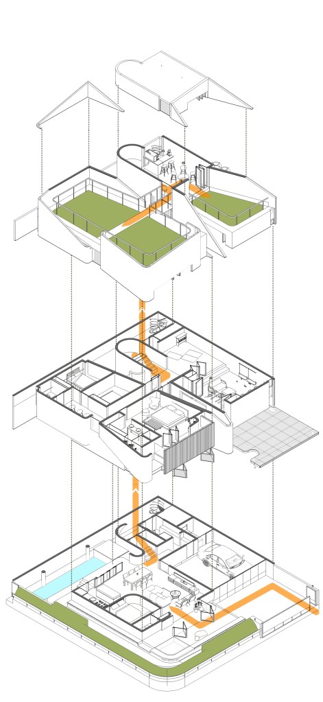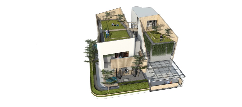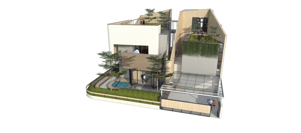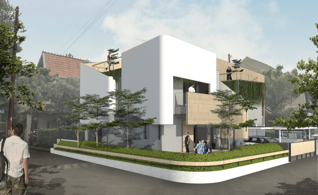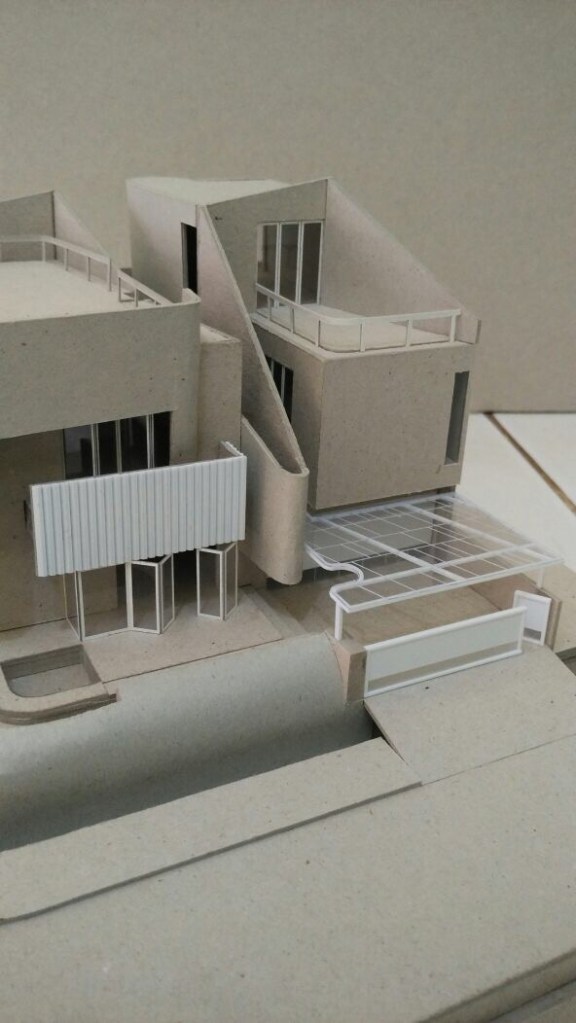 Berbekal identifikasi isyarat2 di atas, saya mengusulkan solusi dari isu2 tersebut ke Riri dalam bentuk sesosok bangunan dua massa yang berorientasi ke arah dalam hunian.